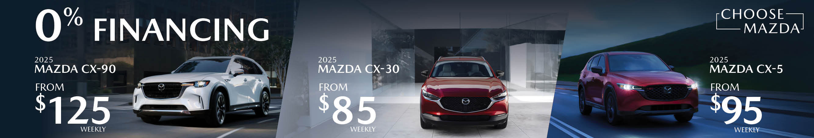 AMVIC licensed business. Vehicles are for illustrative purposes only and do not represent actual vehicles for sale. All offers, OAC and does not include taxes and other fees. Lease from $95 weekly applies to 2025 CX-5 GX, STK#25C54584, for 36 months at 1.45%, MSRP $36,025, with $1,000 down. Lease end value $20,584. 16,000 km annual allowance with a charge of $0.10/km for excess km. Lease from $85 weekly (including Mazda Loyalty) applies to 2025 CX-30 GX, STK#L25CX0277, for 36 months at 1.95%, MSRP $32,426, with $1,000 down. Lease end value $18,166. 16,000 km annual allowance with a charge of $0.10/km for excess km. Lease from $125 weekly (including Mazda Loyalty) applies to 2025 CX-90 GS-L, STK#25CX98673, for 36 months at 0.69%, MSRP $54,525, with $0 down. Lease end value $32,960. 16,000 km annual allowance with a charge of $0.15/km for excess km. First payment, security deposit, and applicable fees due at lease inception. 0% financing available on the 2025 CX-5, and 2025 CX-30, up to 36 months finance with loyalty rebate or the 2025 CX-70 PHEV and 2025 CX-90 PHEV on a lease up to 36 months with loyalty. No monthly payments for 90 days applies to 2025 models only. Some conditions apply. See dealer for details. Offers end Dec 1, 2025.